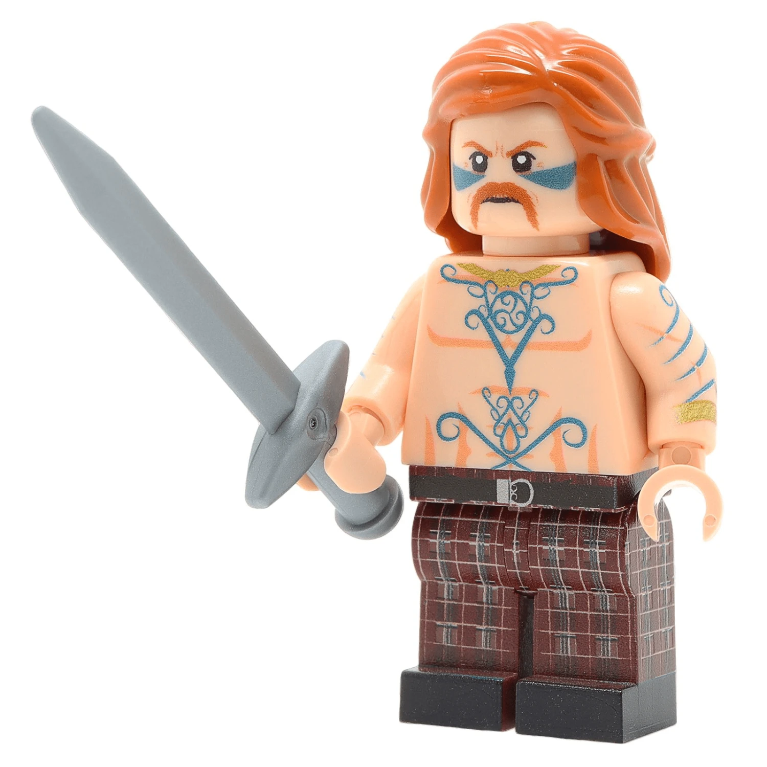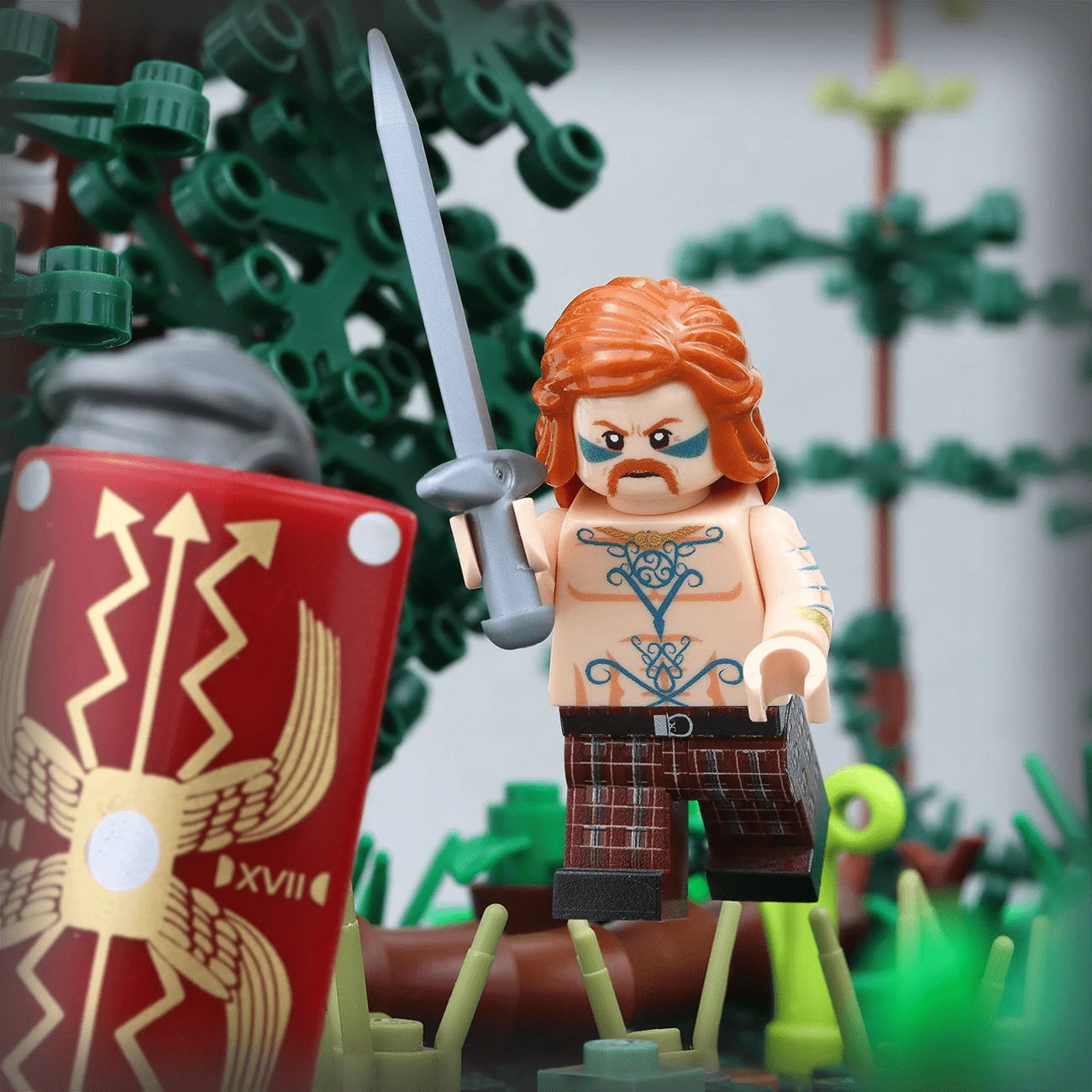 Celtic warfare was organised by clan grouping and social class, in stark contrast to the organisation of the Roman Army. Dionysius said that their “manner of fighting, being in large measure that of wild beasts and frenzied, was an erratic procedure, quite lacking in military science…” Our minifigure is adorned in blue tattoos, and is in keeping with how the Celtic Britons were described by Caesar.Â