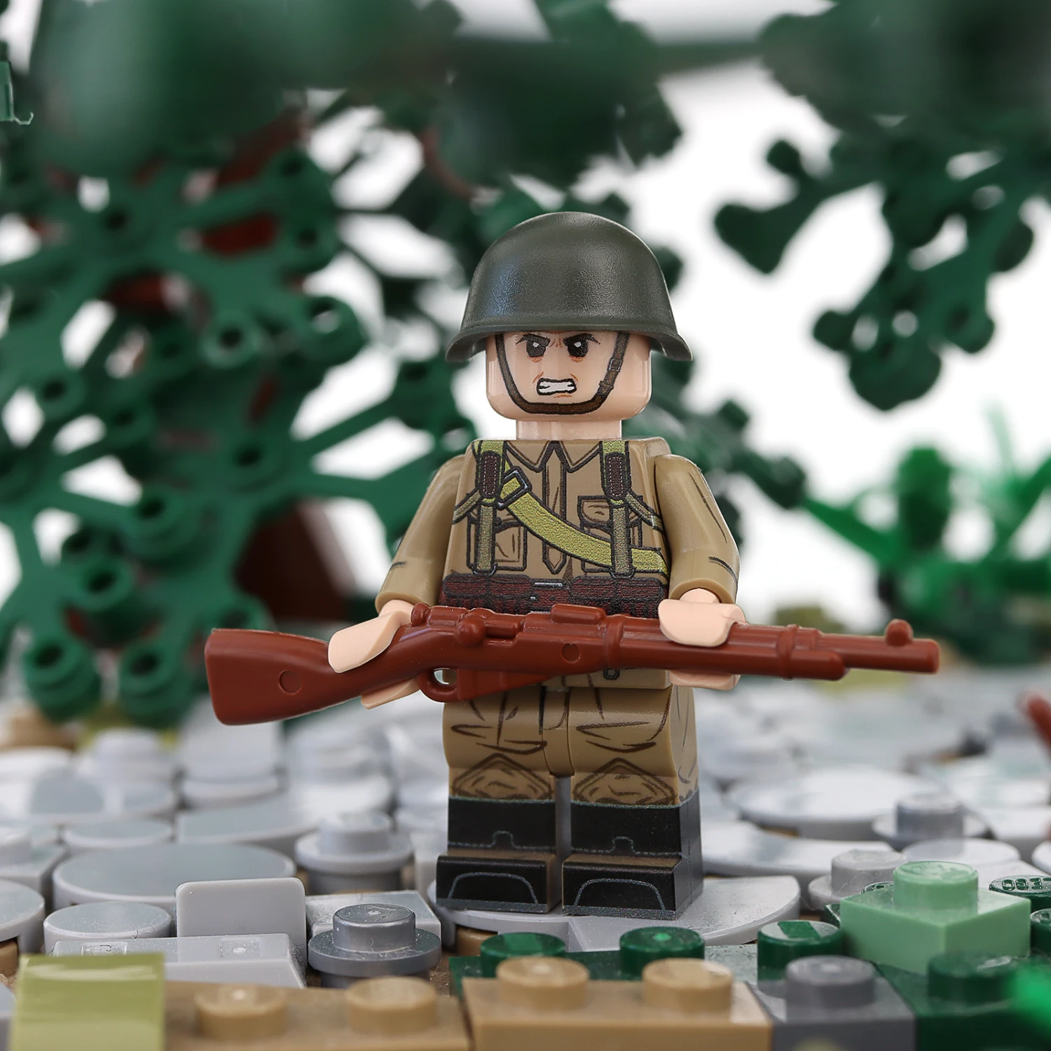 United Bricks custom printed collectable minifigures are printed on genuine brand new LEGO parts using a high quality UV printing method. They make the perfect gift or addition to a collection, and are a great way to learn history through building and creating scenes. Comes with BrickArms OD green SSh-40 helmet and brown mosin nagant rifle.