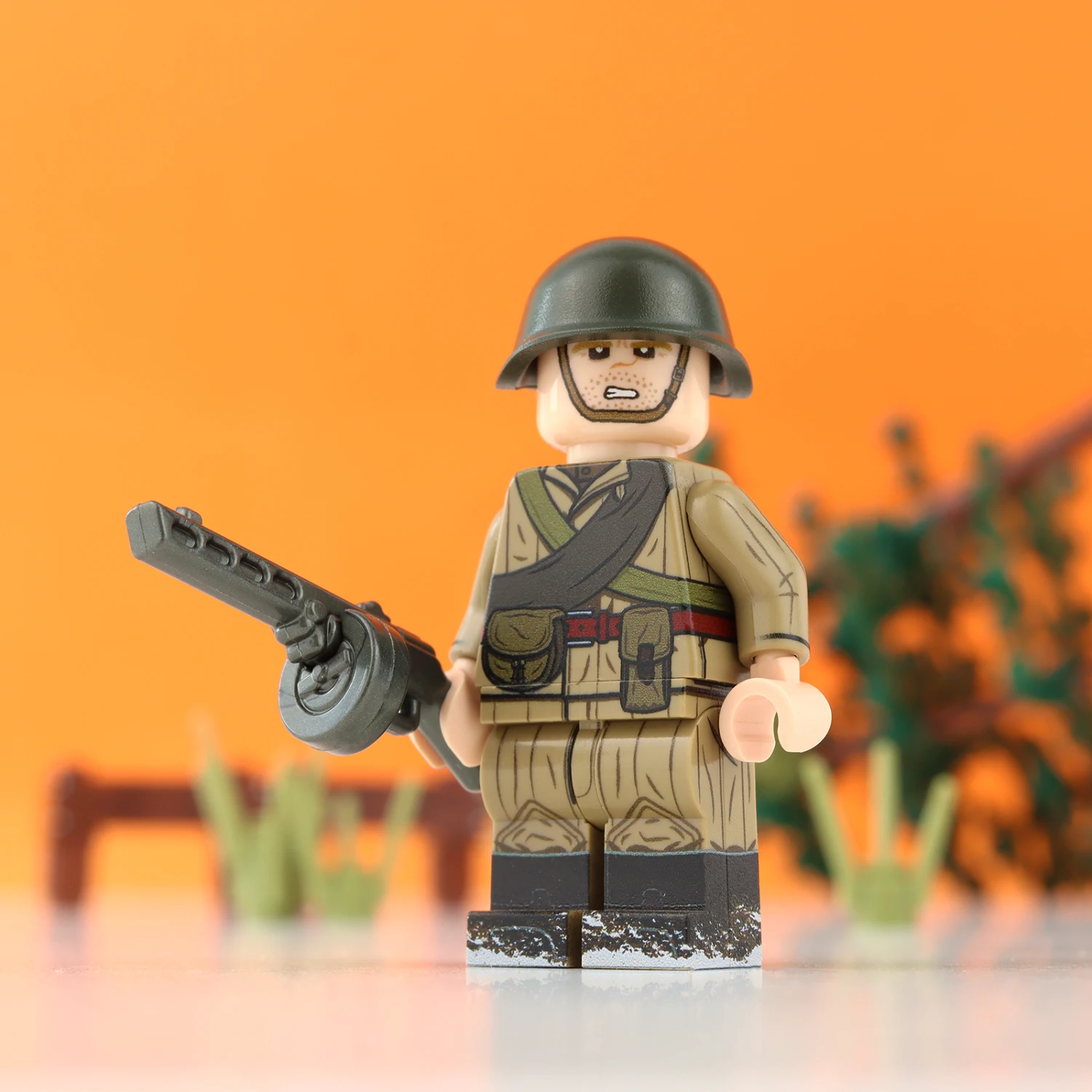 United Bricks custom printed collectable minifigures are printed on genuine brand new LEGO parts using a high quality UV printing method. They make the perfect gift or addition to a collection, and are a great way to learn history through building and creating scenes. Comes with BrickArms OD green SSh-40 helmet and gunmetal PPSh v2.